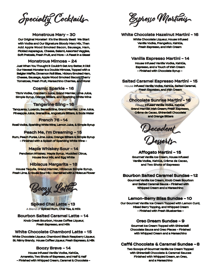 Shake Off the Sunday Blues with Our Sunday Brunch. Try Our Heavenly Strawberry Belgian Waffles or Our Breakfast Charcuterie! Don't Forget to Start Your Meal Out with a Mimosa or One of Our Famous Monstrous Marys!